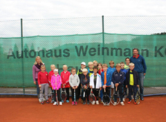 Das 9. Haushamer Kleinfeldturnier lockte junge Tennispieler und Spielerinnen aus ganz Oberbayern und München auf die Tennisplätze der SG Hausham. Zum 9. Mal richtete die SG Hausham ihr Kleinfeldturnier aus. Über 20 Kinder konnten die Turnierleiter Stefanie Kuhn und Matthias Müller auf der Tennisanlage in Hausham begrüßen. Mit dabei die besten Spieler aus Oberbayern/ München. Das Turnier war dieses Jahr wieder ein offizielles Turnier der „Kleinfeld Champ Serie“ des Tennisbezirks Oberbayern/ München. Bei diesem letzten Qualifikationsturnier konnten sich die Sieger und Plazierten für das Masterturnier nächste Woche in Oberschleißheim qualifizieren. Was die Kinder zwischen 5 und 8 Jahren schon auf dem Tennisplatz können, begeisterte die Zuschauer. Schnelle Aufschläge und tolle Ballwechsel konnten man von den jungen Ballkünstlern bewundern. „Ich weiß nicht, ob ich gegen jeden noch im Kleinfeld gewinnen würde“, dachten sich bestimmt der ein oder andere Besucher. Ein toller Erfolg gelang Sophie Müller von der SG Hausham. Sie siegte in ihrer Altersklasse im Finale gegen Franziska Kreysing (Iphitos München) und begeisterte dabei mit toller Technik. Den dritten Platz sicherte sich Lena Gashi vom SV Lohhof gegen Leonie Müller von der SG Hausham. Sie kann sich aber über ihren 4. Platz in dem starken Feld freuen. Spektakulär ging es im Finale der Jungen zu. In einem sehr ausgeglichenen Match mit vielen sehenswerten Ballwechseln setzte sich Moritz Müller vom TC Blutenburg München gegen Leopold Henss von der SV Pang durch. Einen Achtungserfolg schaffte Philipp Wambach vom TC Schliersee. In der jüngsten Altersklasse gewann er seine Gruppenspiele souverän und verlor nur im Halbfinale gegen den späteren Zweitplazierten Aurele Weiß vom TC Dachau. Im kleinen Finale gewann Philipp und sicherte sich so den dritten Platz und konnte stolz den Pokal entgegen nehmen. Sieger in dieser Altersklasse wurde Marco Ontiveros vom TC Penzberg. „Vielen Dank für die tollen und vor allem ausnahmslos fairen Spiele. Wir freuen uns schon auf das nächste Jahr“, sagte Vorstand Matthias Müller bei der Siegerehrung und überreichte den jungen Sportlern ihre Urkunden und Pokale. Hier finden Sie ein paar Fotos!