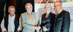 Mit dem Ehrenamtspreis „Engagiert 2018“ wurde Josef Langenwalter (2.v.l.) vom BLSV-Bezirkstagspräsidenten Josef Mederer (r.) und der BSLV-Bezirksvorsitzenden Claudia Daxenberger geehrt. Christian Großhauser (l.) vertrat in Kaltenberg die Vorstandsriege der SG Hausham. Foto: Markus Kroha/kn
