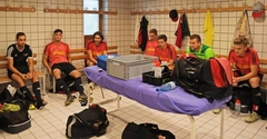 In ihrer Kabine haben die Fußballer der SG Hausham darauf gewartet, dass das Spiel gegen Rot-Weiß Bad Tölz wieder angepfiffen wird. Foto: Thomas Plettenberg