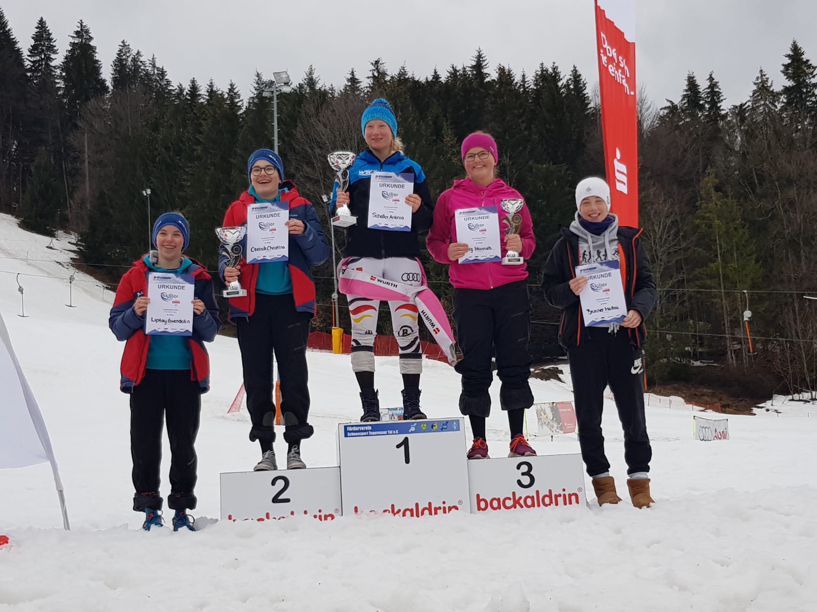 Am Sonntag stand der spannende und aufregende Team-Parallelslalom an. Pia konnte sich mit ihrem Team OL(Oberland)-Tigers nach der zweiten Runde voll auf das Anfeuern konzentrieren. Emma musste mit dem Team OL-Lions im Halbfinale gegen die OL-Panthers antreten und ihr Team verlor mit nur 12 Hundertstel Rückstand. Dafür holten sie sich die Bronzemedaille durch einen Sieg gegen Team Sachsen. Die OL-Panthers holten Silber. So fuhren Emma mit Bronzemedaille und Pia ohne Stimme glücklich nach Hause.