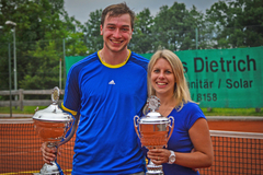 Am Sonntag (nicht all zu früh) fanden dann die noch zu absolvierenden Spiele statt. Es qualifizierten sich ins Finale der Damen Lena Schöpfer, die Titelverteidiger, und Steffi Kuhn. Ein Spiel mit langen Ballwechseln fand nach ca 2 Std. ihre Siegerin. Steffi Kuhn gewann mit 7:5, 6:4. Bei den Herren standen sich Benedikt Galler und Mike Schaftari gegenüber. Ein spannendes Spiel mit teilweise sehr spektakulären Ballwechseln, wurde dem zahlreichen Publikum geboten. Mit 6:1 und 7:5 gewann Bededikt Galler das Match. Die Turnierleitung hatten Andi Wagenpfeil und Peter Empl, die wieder einmal einen super Job gemacht haben.
